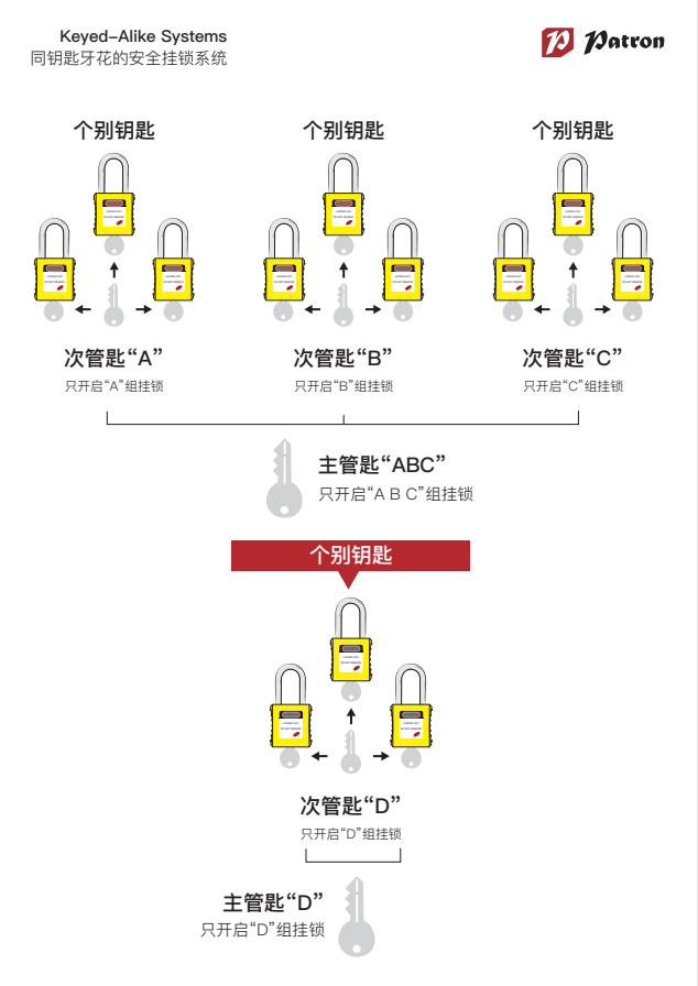 在大型的生產埸地中往往遇上一個工程師操控多臺設備的情況。傳統上,他們將需要單獨的鑰匙來打開每把掛鎖,這樣對工程師來說自然增加額外的操作時間和其他的不方便。這時一套鉑鉺盾(Patron)相同鑰匙牙花的安全掛鎖便讓這項工作變得非常容易。