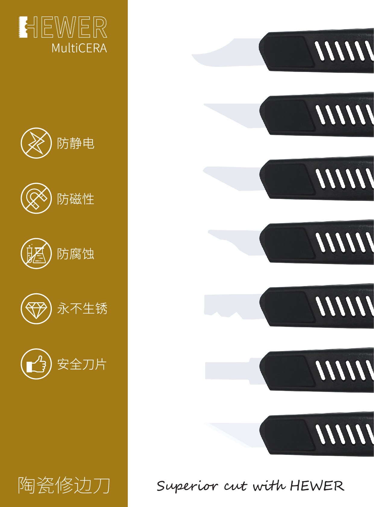 HEWER MultiCERA 安全陶瓷修邊刀可配合多款不同形狀的刀片使用,讓您在不同角度下進行工作。而其刀柄除了采用超耐用的玻璃尼龍材質,還附有備用刀片庫,可讓您輕易地在多款刀片之間進行切換,方便又好用!HEWER MultiCERA 安全陶瓷修邊刀擁有特別設計的纖細刀柄,可讓您以各種刁鉆的角度,將刀片伸至許多難以觸及的地方來進行切割作業。